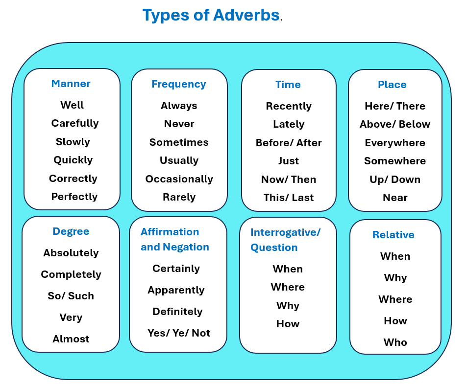 There are many different types of adverbs, see the chart below.