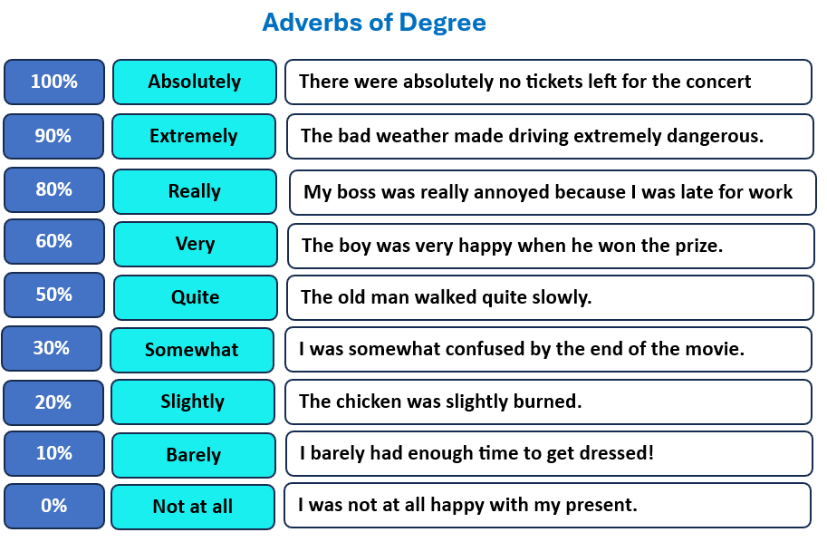 See the chart below for a general guideline on how strongly an adverb of degree can describe an adjective, verb or adverb, with a sample sentence for each.