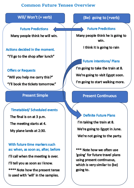 Will and Won’t are generally the first future form that students learn and as they develop their language skills they need to understand the differences between the tenses and how they are used.