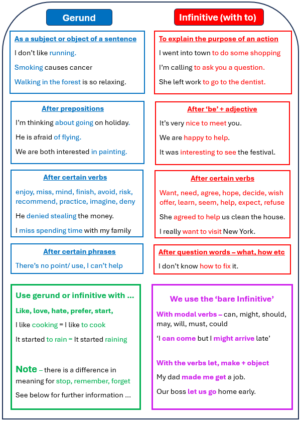 This section will look at how/ when these verb forms are typically used. See the chart below which explains the most common ways we use these verb forms: