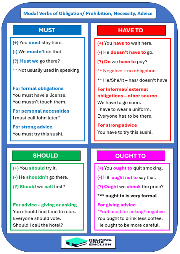 - Must/ mustn’t – obligation, prohibition and strong advice